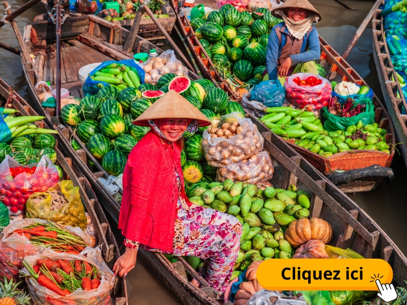 Nel cuore del mercato galleggiante di Cai Rang, i banchi traboccano di frutti tropicali colorati : manghi, rambutan, frutti del drago o jacchieri maturi al sole. Lasciatevi sedurre dai loro aromi esotici e dalla loro freschezza impareggiabile, simbolo del delta del Mekong.