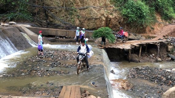 È dopo una decina di ore di viaggio, su strade davvero sconnesse, che siamo arrivati ai piedi del villaggio. Il luogo essendo accessibile solo a piedi o in moto prevediamo di ripartire il giorno dopo alle 5h30 del mattino per fare trekking e caricare le forniture sulle moto!