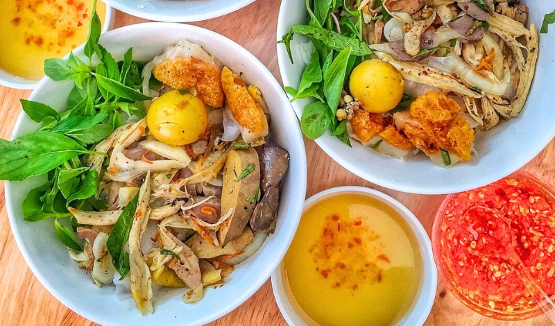 Contrairement au Banh Uot classique accompagné de mortadelle, cette version typique de Dalat associe des crêpes de riz souples à du poulet effiloché, des abats tendres, et une salade de poulet légèrement acidulée. Le tout est arrosé d’une sauce nuoc mam sucrée-salée, parfumée de herbes fraîches. Un plat étonnant, équilibré et très apprécié au petit déjeuner ou en repas léger.